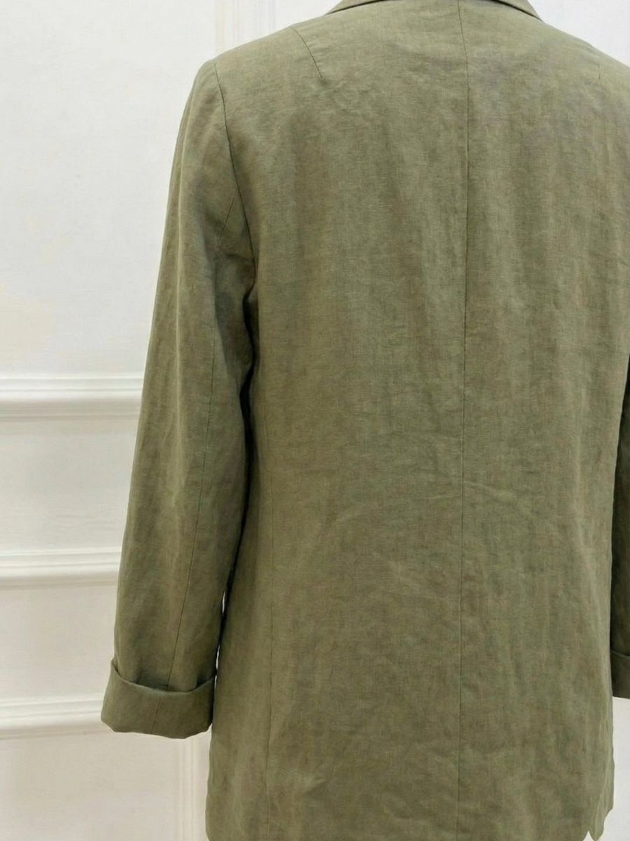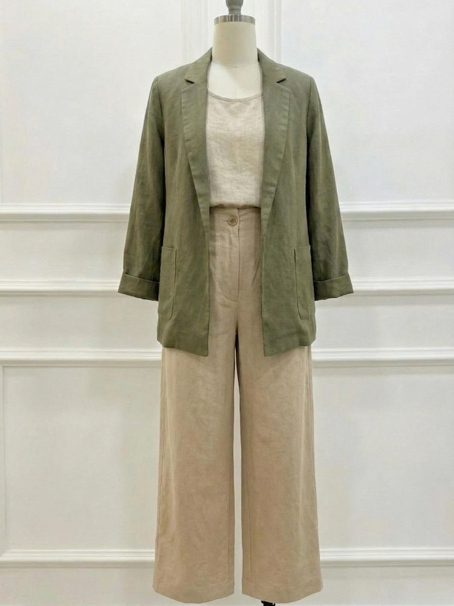 Bạn có thể diện nguyên set như hình mẫu để có tổng thể hoàn hảo nhất. Hoặc tách lẻ: chiếc blazer xanh rêu có thể khoác ngoài váy lụa hai dây; quần linen ống rộng màu be phối cùng áo sơ mi trắng oversized đều rất thời trang.